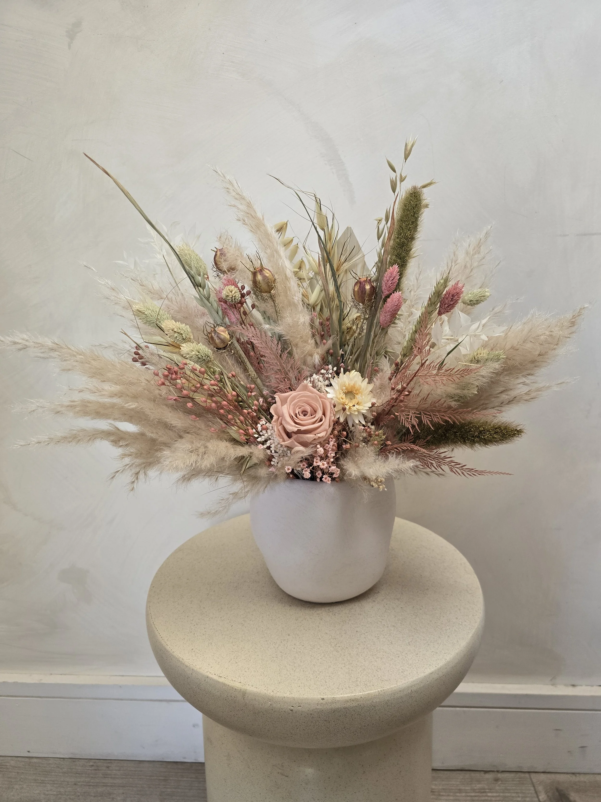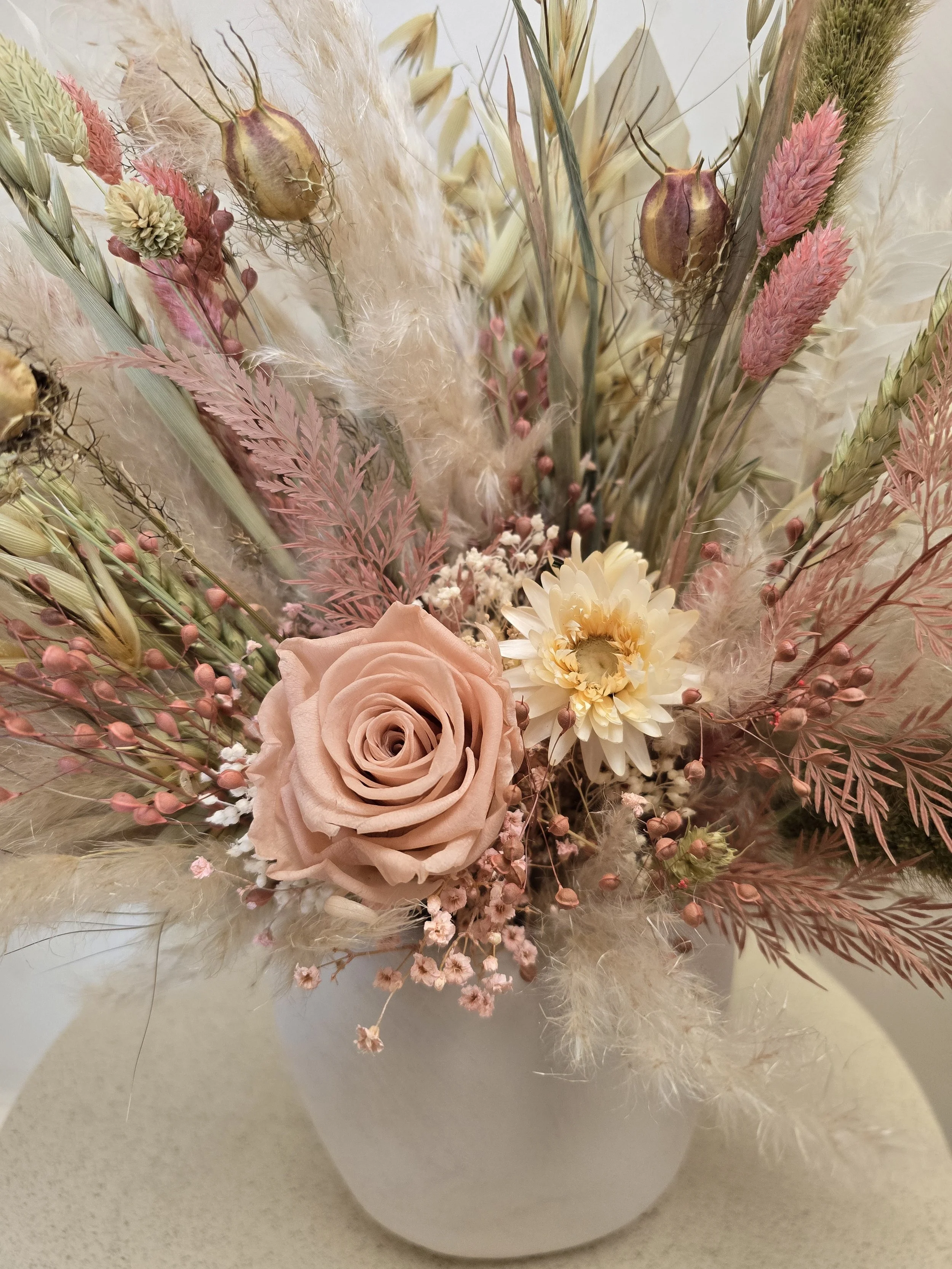 A stoneware pot filled with dried and preserved flowers, including a rose, ruscus, fern, various grasses and other beautiful florals