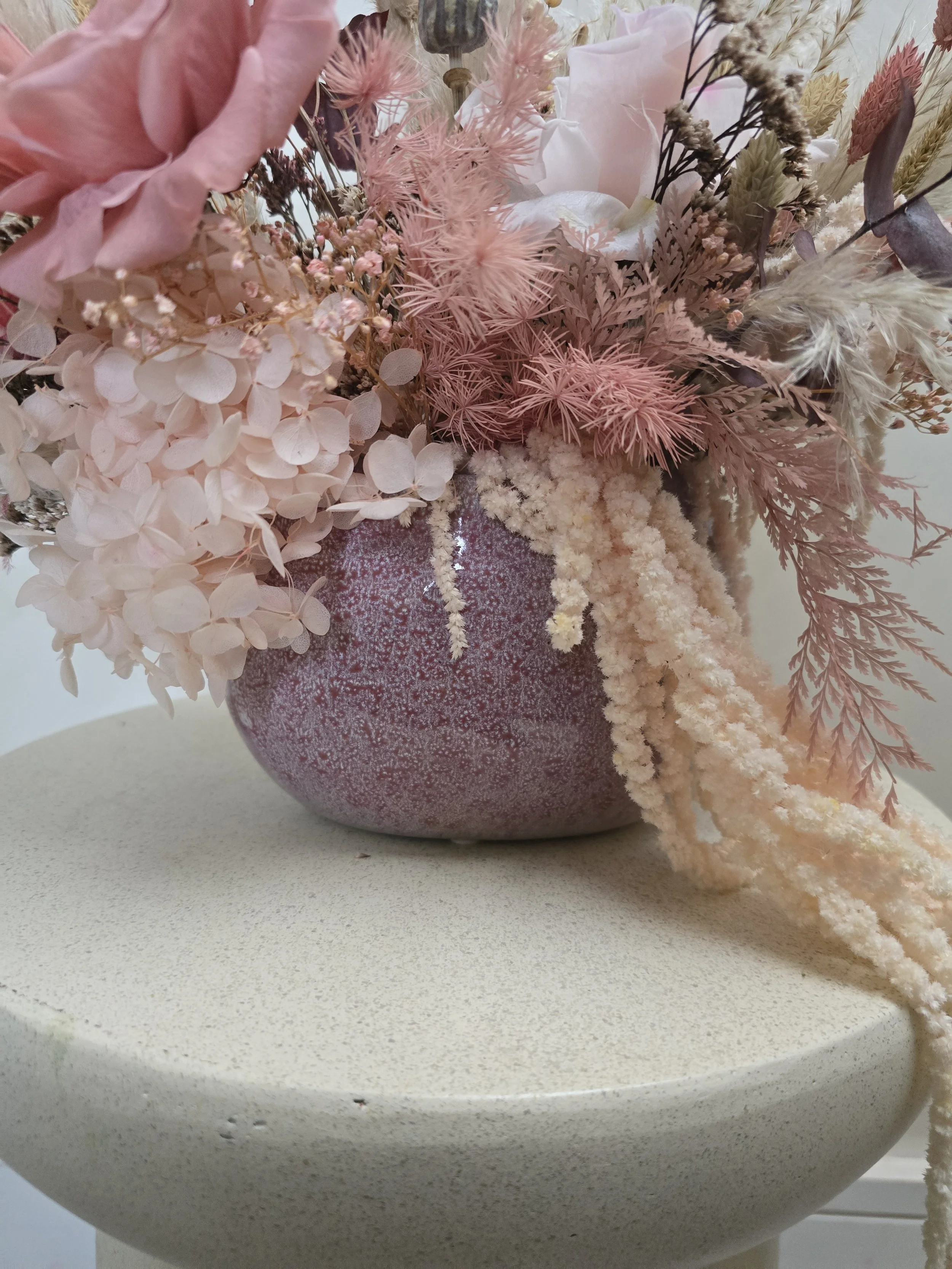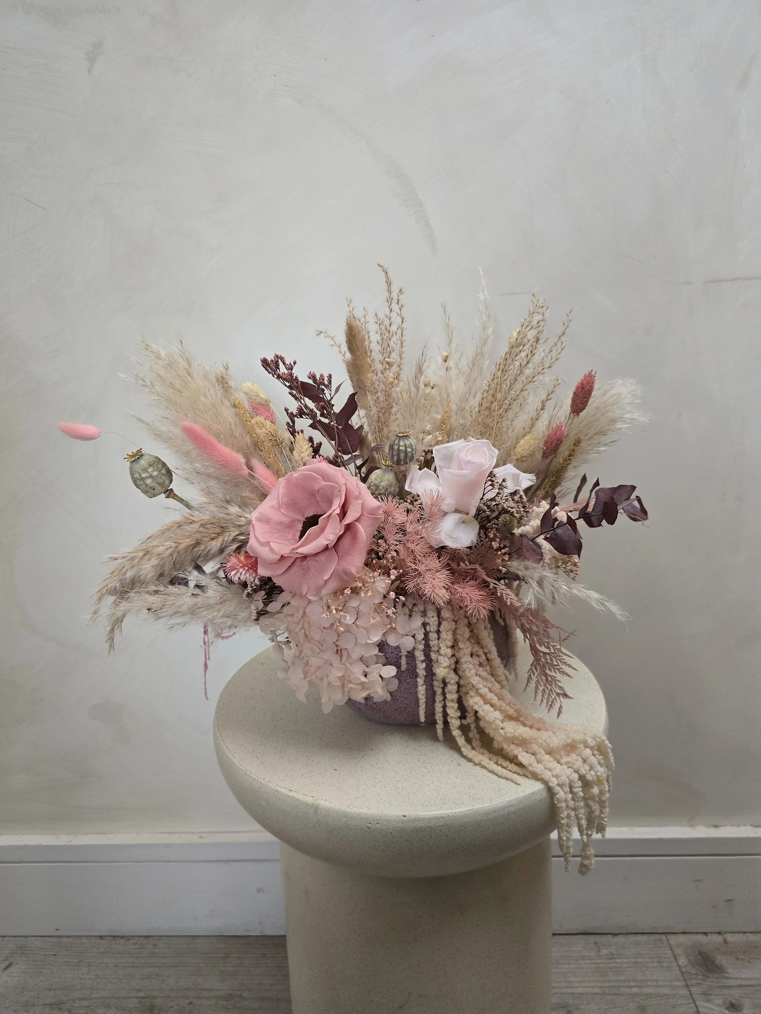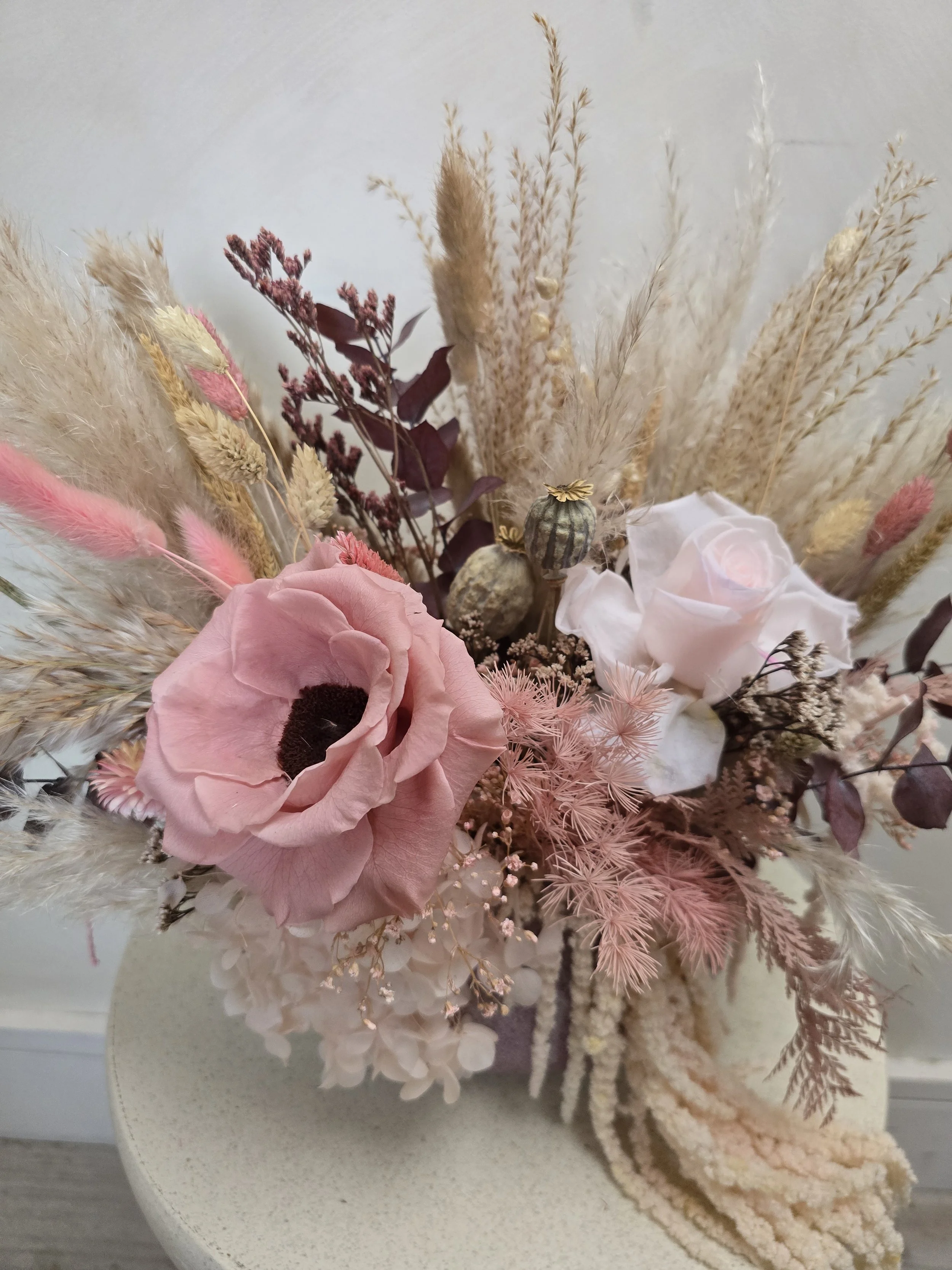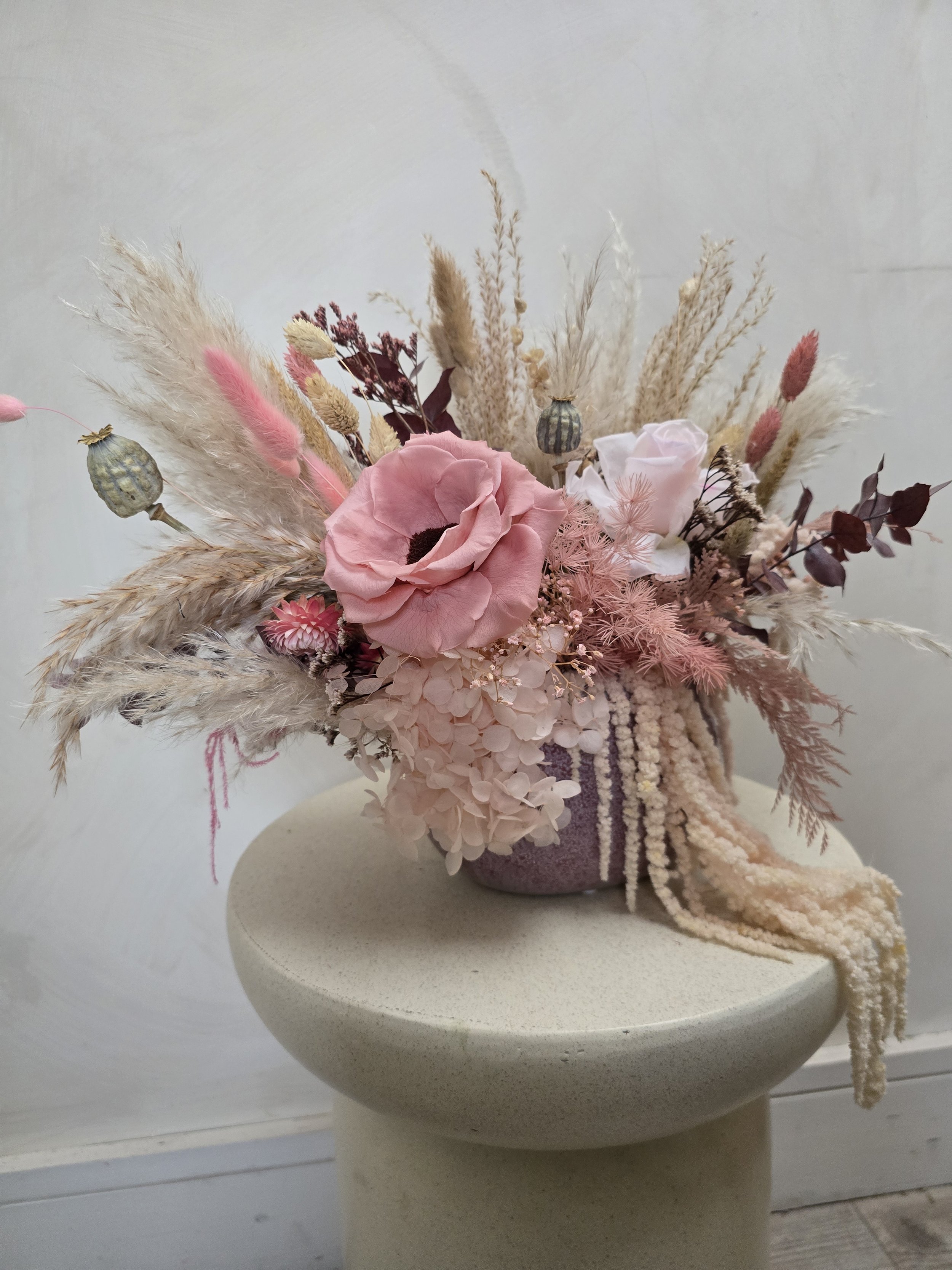 A ceramic pot filled with luxurious preserved and dried flowers, including an anemone, rose, amaranthus, eucalyptus, dried grasses, poppy seed heads and more