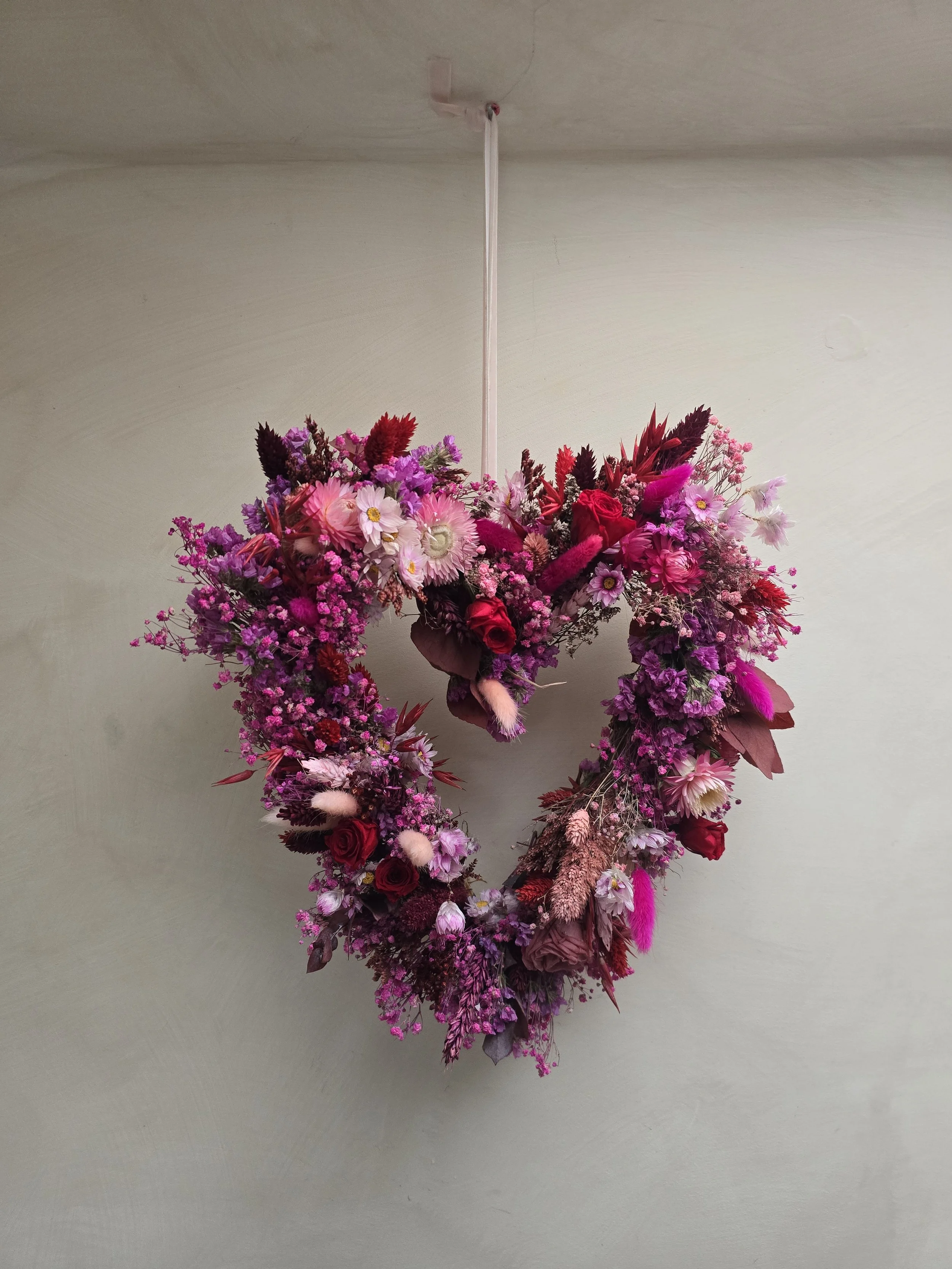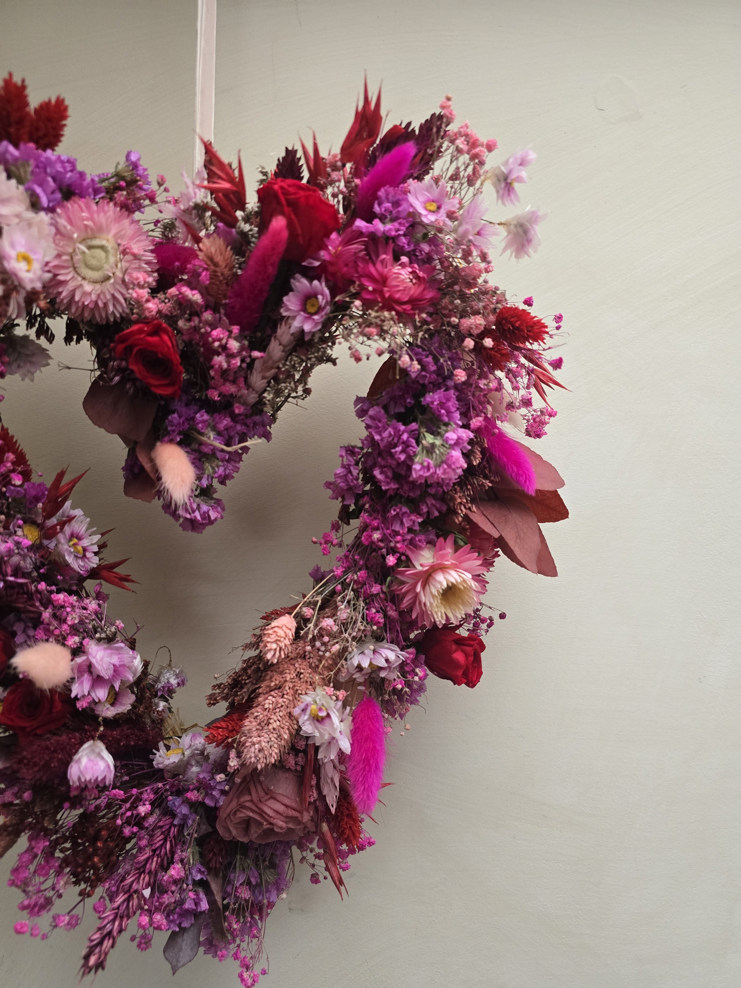 A beautiful hearty shaped wreath made on a 30cm straw base, consisting of baby’s breath, statice, helichrysum, acroclinium, phalaris, roses & more