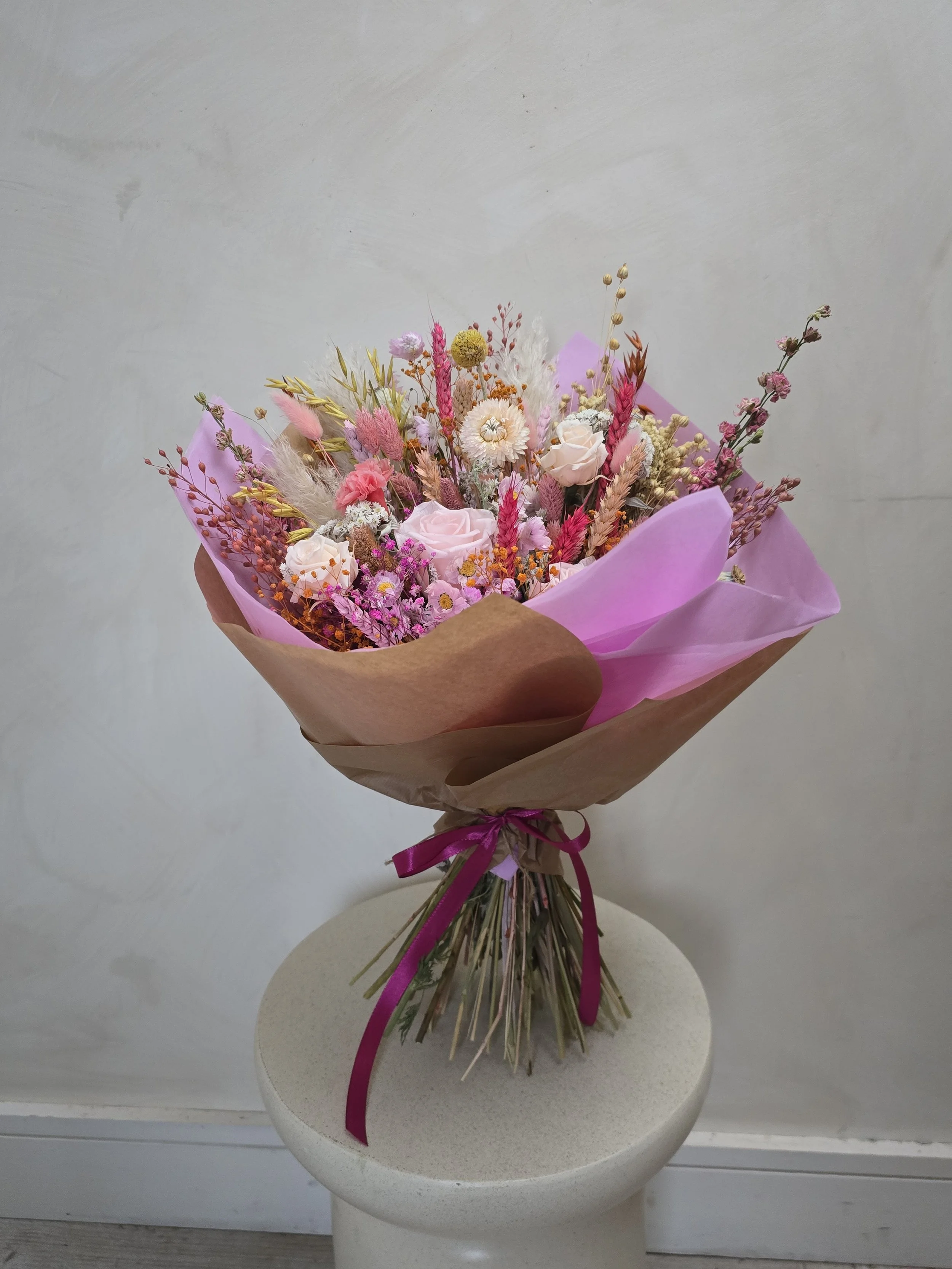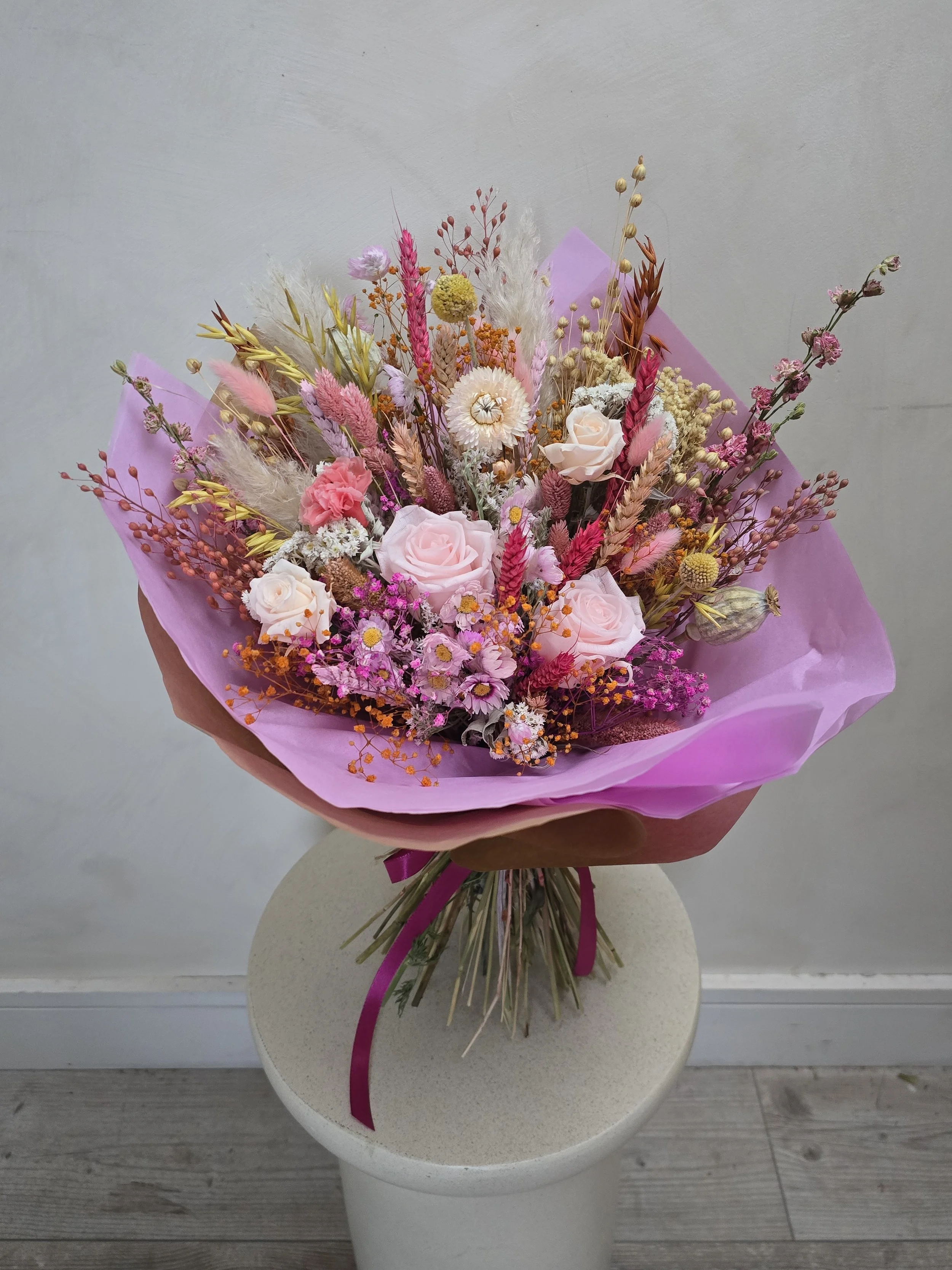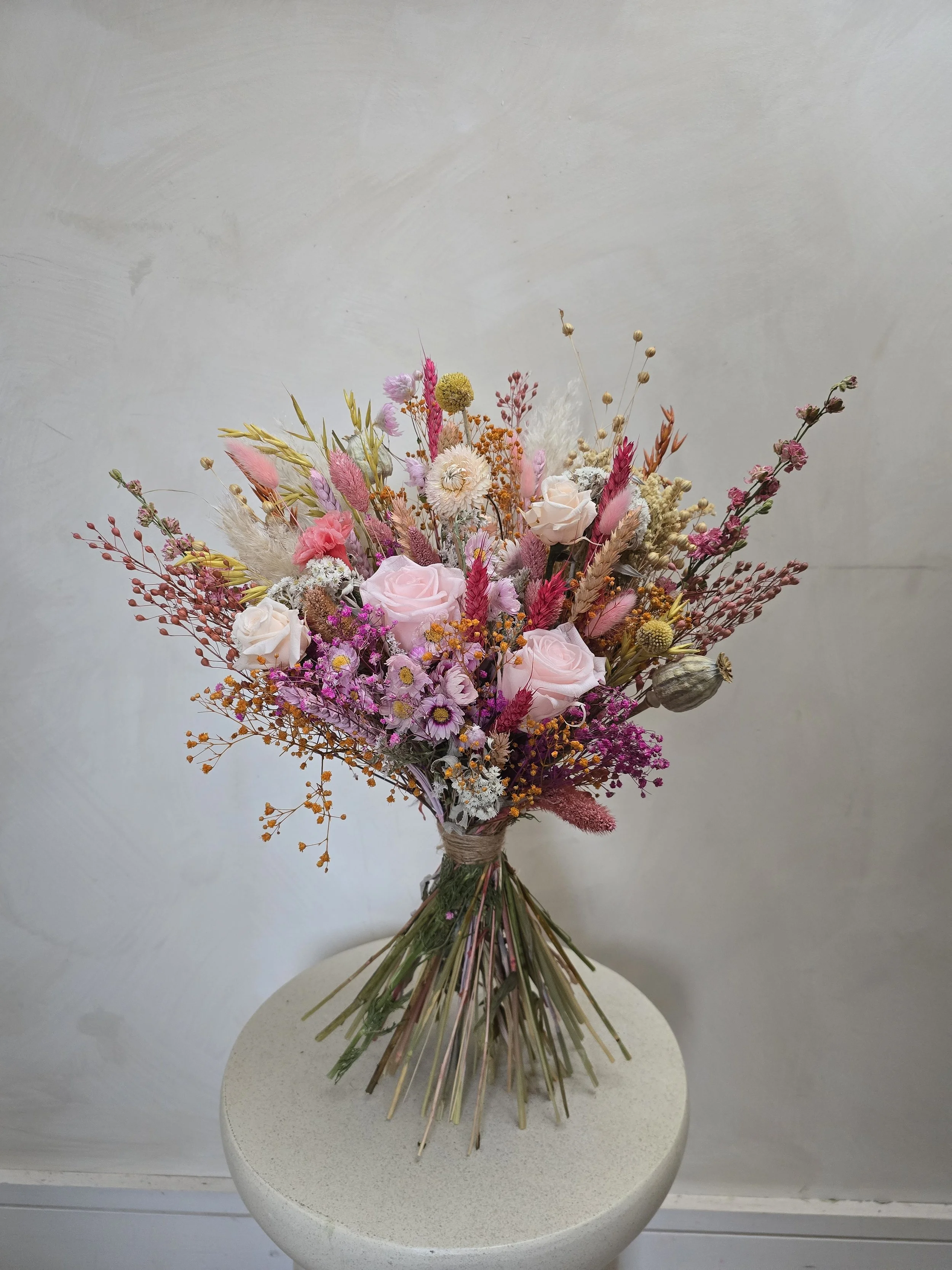 A bouquet of soft peaches and pink tones, consisting of preserved roses, baby’s breath, dried acroclinium, poppy seed head, craspedia, oats & more