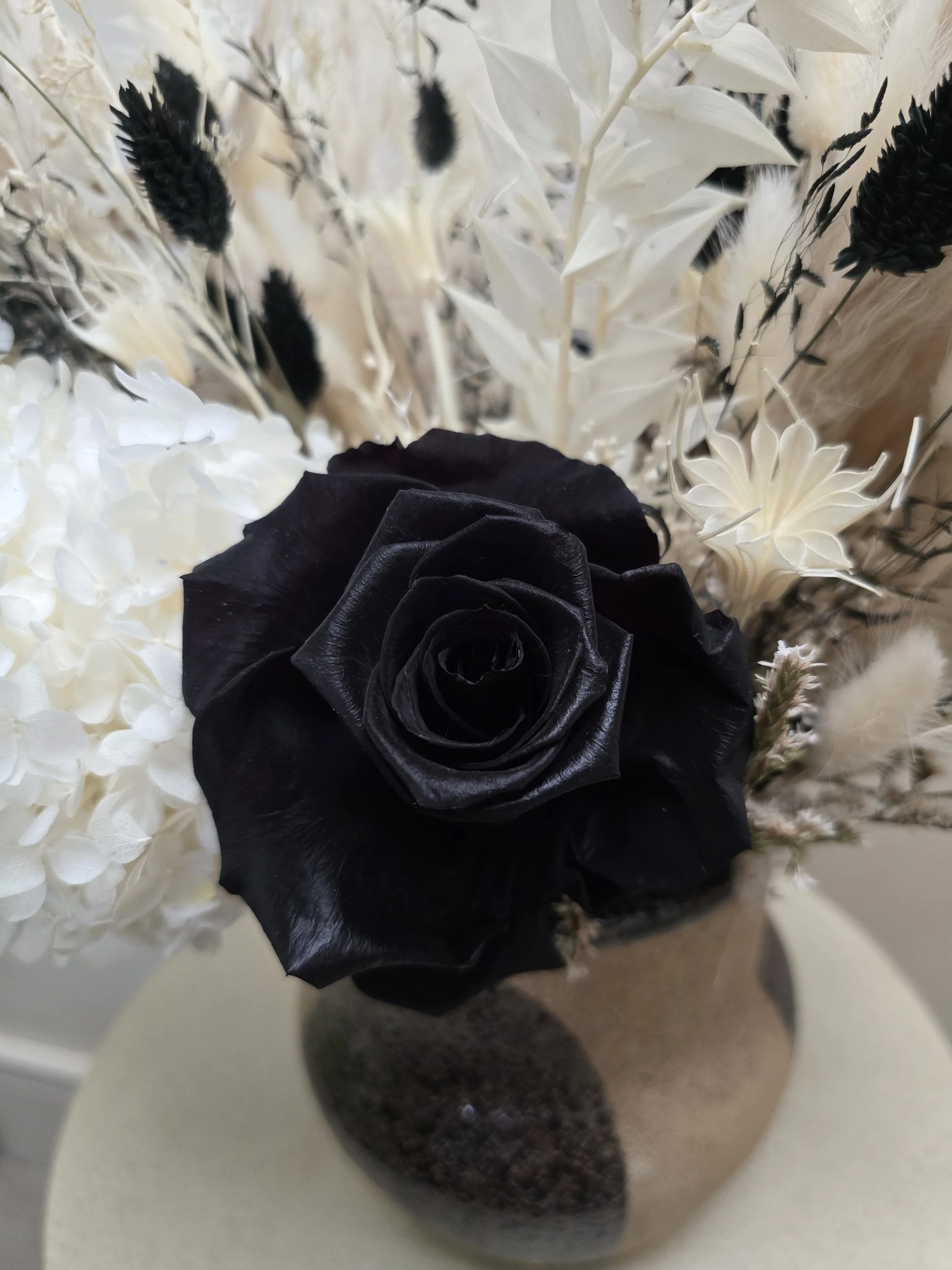 A beautiful handpainted stoneware vase filled with a preserved rose, hydrangea, fern ruscus, dried nigella, statice and various grasses
